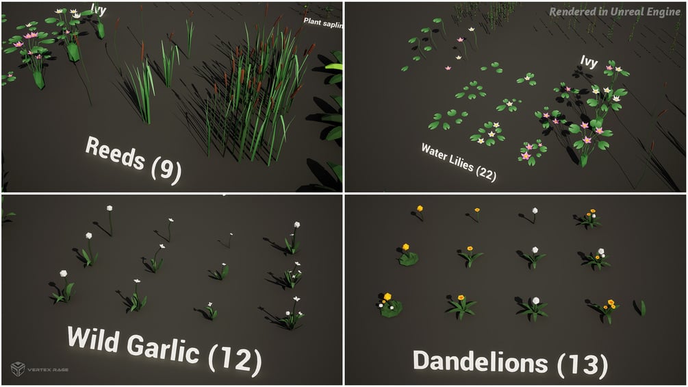• Plants: 196 models, including Bluebells (9), Daisies (15), Dandelions (13), Ferns (13), Foxgloves (9), Ivy (52: 20 complex, 20 simplified variants and 10 clusters, and 2 leaves), Nettles (36), Reeds (9), Water Lilies (22) and Wild Garlic (12), generic saplings (6)